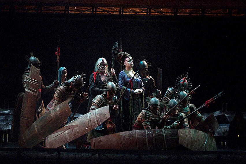 De la producción de David McVicar ya se ha hablado mucho por ahí. A mí, como su reciente Vuelta de tuerca en el Real (enlace), me ha gustado bastante, sin entusiasmarme. Me parece un acierto haber renunciado por completo a la iconografía egipcia, que resultaría inevitablemente kitsch para un espectador de hoy, para en su lugar haber recreado una civilización imaginaria mezcla de muchas otras en la que brilla con luz propia el imaginativo y fastuoso vestuario de Moritz Junge. La escenografía de Jean-Marc Puissant, eso sí, resultaba más bien fea, y en exceso oscura la por lo demás muy cuidada e interesante iluminación de Jennifer Tipton. Las coreografías en plan samurai de David Greeves para la marcha triunfal me llamaron particularmente la atención porque la idea es casi idéntica (sables aquí en lugar de estacas) a la que ofreció Stefano Poda para resolver la misma escena en la producción -de origen mallorquino, si no recuerdo mal- que vimos hace años en Jerez de la Frontera. A la dirección de actores propiamente dicha se le podía haber sacado muchísimo más partido.