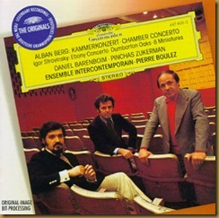 3. Zukerman, Barenboim. Boulez/Ensemble Intercontemporain (DG, 1977). Han pasado diez años desde su primer registro. Boulez sigue igual a sí mismo, quizá ahora un punto menos seco y más misterioso. Barenboim también mejora ligeramente su recreación con un toque algo más variado. Pero el admirable Ensemble de Boulez es capaz de muchas mayores sutilezas técnicas y expresivas que los, en cualquier caso, meritorios chicos de la BBC de su grabación anterior, mientras que Pinchas Zukerman, en el cénit de su carrera –en 1984 vendría su increíble Concierto a la memoria de un ángel con el propio Boulez–, alcanza el punto perfecto de equilibrio entre lo lírico y lo dramático haciendo gala de un impresionante virtuosismo. La toma sonora, magnífica incluso para el estándar de hoy día. (9).