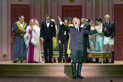 El resultado es sumamente irregular. El prólogo comienza de manera poco convincente: tanta puerta que se abre y cierra llega a marear, mientras que el gag de la falda de Zerbinetta enganchada en la cremallera del varón se estira de manera fastidiosa. Luego la cosa va mejorando, se aprecia una excelente dirección de actores y el humor de sal gorda por el que se apuesta llega a funcionar, incluyendo ese mayordomo encarnado por el actor Michel Witte que es un trasunto de Hitler. Cuando comienza la segunda parte el Compositor sigue ahí, tendido en el suelo aferrado a la partitura. Pronto aparecen las náyades y Ariadne, todas ellas con caracterización voluntariamente ridícula. Los numeritos folclóricos “andaluces” resultan muy bien recibidos, y toda la parte de Zerbinetta se encuentra estupendamente resuelta. Un acierto que se haga que la pobre soprano que encarna a Ariadne intente infructuosamente seguir la corriente a los cómicos, como también que el Compositor intercambie un beso volado con Zerbinetta. En toda esa parte lo pasamos en grande.